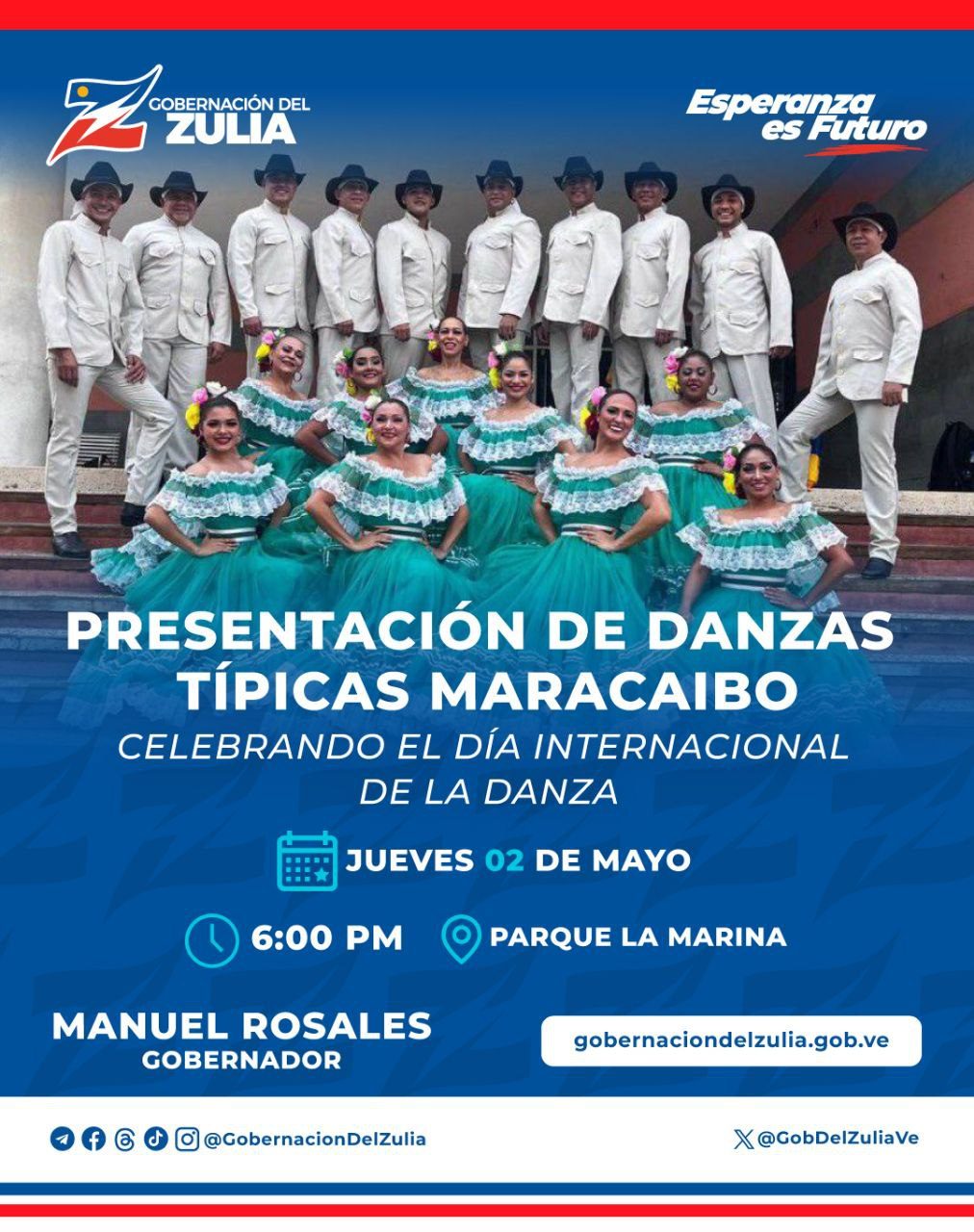 La Gobernación del estado Zulia, a través de las Secretarías de Cultura y Turismo, se complace en anunciar la celebración del Día Internacional de la Danza con una presentación especial de Danzas Típicas Maracaibo. El evento se llevará a cabo el jueves 2 de mayo, a partir de las 6:00 p.m en el Parque La Marina.