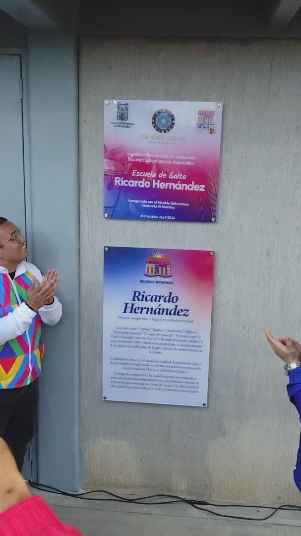 Seguidamente, se realizó el acto inaugurar del despeje de placa para su inauguración oficial. Recordemos que la Escuela de Gaita lleva el nombre del reconocido cantautor Ricardo Hernández, quien es músico, compositor, arreglista y productor musical. Con éxitos como «Cepillao», «Pastelero», «Maracucha», «Billetero», «Sentimiento nacional», «Un cigarrito y un café, «Tremenda negra» «Huele a Navidad, entre muchos otros.
