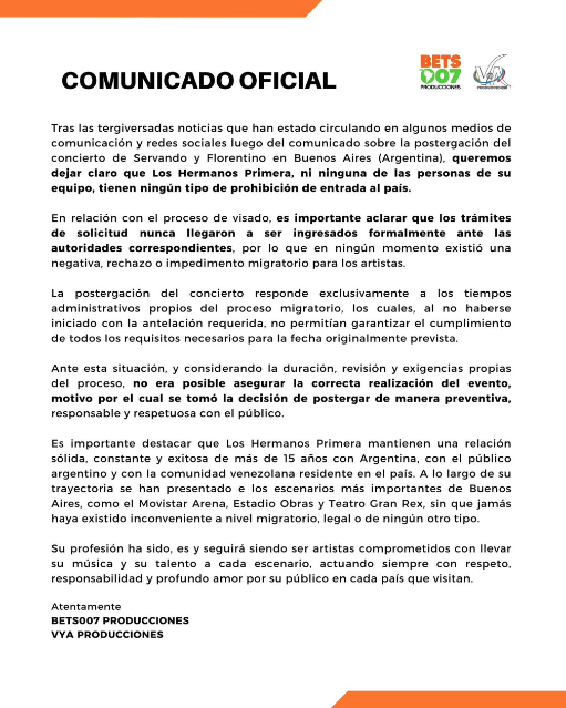 Tras la circulación de informaciones confusas en medios de comunicación y plataformas digitales, las empresas productoras emitieron un comunicado oficial para esclarecer la situación migratoria de los artistas Servando y Florentino Primera en relación con su reciente compromiso en la capital argentina.